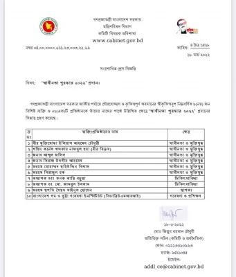 স্বাধীনতা ও মুক্তিযুদ্ধের অবদানের জন্য ৬ জনকে স্বাধীনতা পুরস্কার ২০২২ দেওয়া হচ্ছে। তারা হচ্ছেন— স্বাধীনতা ও মুক্তিযুদ্ধে বীর মুক্তিযোদ্ধা ইলিয়াস আহমেদ চৌধুরী, শহীদ কর্নেল খন্দকার নাজমুল হুদা (বীর বিক্রম), আব্দুল জলিল, সিরাজ উদ্দীন আহমেদ, প্রয়াত মোহাম্মদ ছহিউদ্দিন বিশ্বাস এবং প্রয়াত সিরাজুল হক।